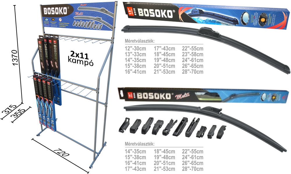 Vásárolható vagy árufeltöltés keretén belül rendelkezésre áll termékbemutató állvány a BOSOKO kampós karokhoz és MULTI-adapteres kivitelben gyártott ablaktörlőkhöz. Részletekért hívja ügyfélszolgálatunkat (42)520-180 telefonszámon.