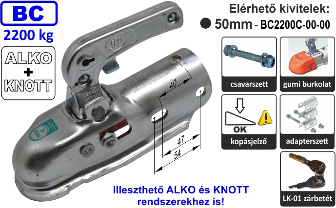 Nagy, 3 tonnás terhelhetőségű, vastag lemez héjszerkezetű vonófej 50mm-es univerzális jellegű, mely egyaránt felszerelhető az ALKO és KNOTT rendszerű vonórudakhoz is. A véknyabb, 45/40/35mm-es kör keresztmetszetű vonórudakhoz az AD-01 adapterszett segítségével illeszthető.