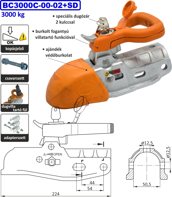Extrém 3 tonna terhelhetőségű öntvény vonófej kényelmi felszerelésekkel, úgy mint a vontató jármű fényezését védő puha gumiburkolat, a masszív dugózár és a komfort kialakítású kioldókar, mely alkalmas a dugvilla tárolására is, valamint színezett kopásjelzővel. Külön opcióként rendelhető: • AD-01 adapterszett, mellyel a vonófej felszerelhető 45mm/40mm/35mm-es vonórúdra is • nagyszilárdságú csavarszett. A ház strapabíró öntvény, héjvastagsága kb. 6 mm.