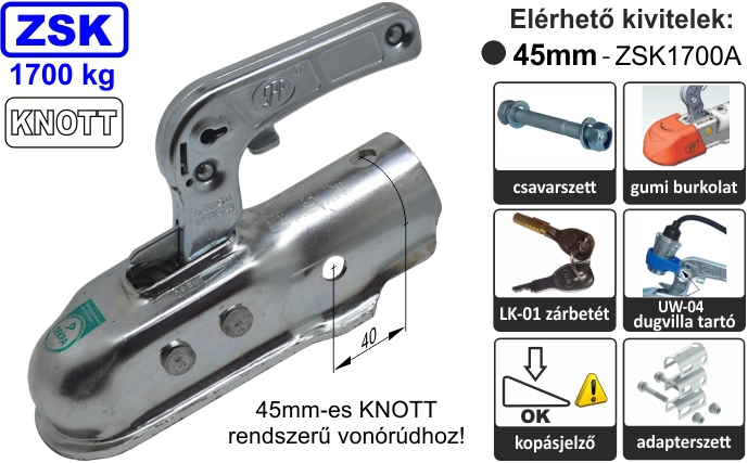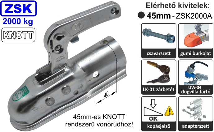 A vonófejet közepes terhelhetőségű utánfutókhoz ajánljuk, melynek rögzítése 45mm-es KNOTT rendszerű. A véknyabb, 40/35mm-es kör keresztmetszetű vonórudakhoz az AD-01 adapterszett segítségével szerelhető fel.
