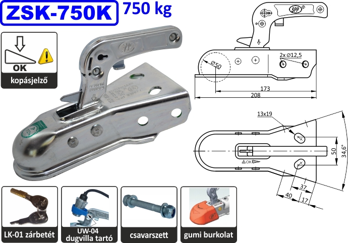 Megakadályozza a gépjármű vonóhorgára akasztott utánfutó illetéktelen leakasztását. Ez a lopásgátló használata mellett csak a fém elemek vágásával vagy komolyabb mechanika roncsolásával válik lehetségessé. Alkalmazható a legtöbb normál terhelhetőségű lemezteszű vonófejhez. 2db kulccsal forgalmazzuk.