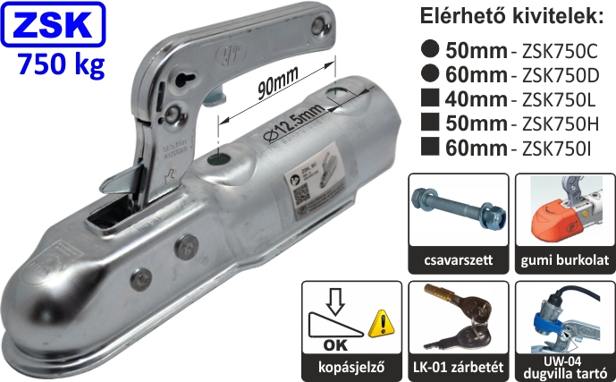 A vonófejet közepes terhelhetőségű utánfutókhoz ajánljuk, melyek vonórúd kialakítása megfelel a vonófej geometriai kialakításának és terhelhetőségének. A vonófejeken van vésett kopásjelző, rögzítőhorony a dugvillatartóhoz és zárbetét illesztő fészek. Külön opcióként rendelhető: • LK-01 zárbetét, • UW-04 dugvilla tartó, • gumi védőburkolat, • valamint nagyszilárdságú csavarszett. A ház héjvastagsága kb. 3,8 mm.