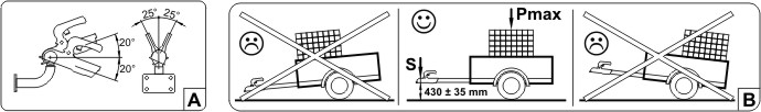 Vonógömbbel kapcsolt állapotban a megengedett elfordulás értékek az A. ábra szerintiek, a megfelelő rakományképzés pedig a B. ábrának megfelelően javasolt.