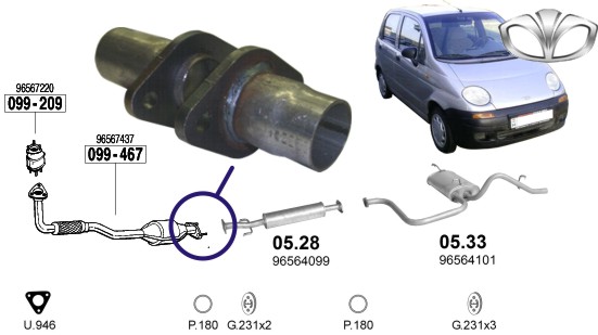 Ez a javítóelem a Daewoo Matiz katalizátoros leömlőcső és a középdob közötti karimás csatlakozóelem javítására szolgál. Figyelem: a képen látható POLMOstrów gyártmányú 05.43 cikkszámú elsődob nincs egybeépítve a katalizátorral, mint a gyári kipufogórendszer.