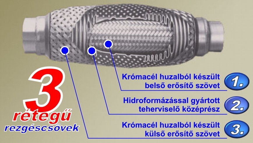 | | A krómacél huzalból készült erősítő szövetek nem hajlamo-sak a korrózióra, így a rezgés-csillapító cső élettartama jóval hosszabb a galvanikus eljárá-ssal kezelt alapanyagokból készült termékeknél. A gyártó folyamatos fejlesztésének e-redményéül az automatizált nagyteljesítményű gyártóbe-rendezéseknek köszönhetően a minőségi alapanyagok hasz-nálata nem eredményez nagyobb árakat. |