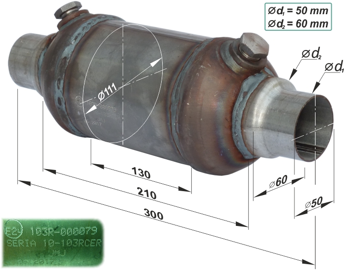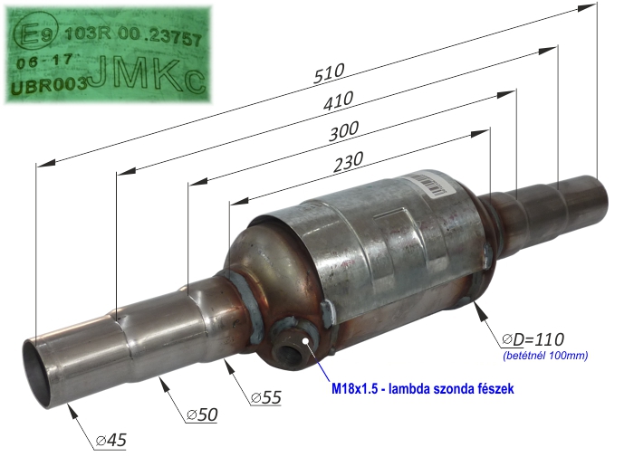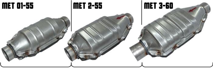 Az európai kibocsátási normák határozzák meg az Európai Unió államaiban eladott új gépjárművek károsanyag-kibocsátásának elfogadható szintjét. A forgalmi engedély "V.9" jelű adatában lesz egy szám, ami a jármű környezetvédelmi osztályba sorolását jelzi. Kínálatunkban megtalálhatóak a benzinüzemű kerámiabetétes 400 cpsi cellasűrűségű, 800 ... 5000 ccm lökettérfogatú motorokhoz, illetve a dízelüzemű fémmagos 200 cpsi cellasűrűségű, 1400 ... 3000 ccm lökettérfogatú motorokhoz alkalmazható katalizátorok. Felhívjuk Tisztelt Ügyfeleink figyelmét, hogy a katalizátortípus helyes kiválasztását és beszerelését bízza a kipufogórendszerek és katalizátorok szerelésére és cseréjére specializálódott szakműhelyekre. Vevőszolgálatunk minden esetben az Ön segítségére lesz a szükséges információkkal. A kiválasztás az alábbi technikai információkat tartalmazó táblázat segítségével lehetséges: | EU norma | Forg.eng V.9: | Kategória leírása | | EURO1 | 1 | 1992-ben bevezetett szabályozatlan katalizátorral szerelt járművek. | | EURO2 | 2 vagy 4 | 1996-tól előírt három gázkomponensre ható lambda szondával ellátott katalizátor. | | EURO3 | 6 | 2000-től kötelező két lambdaszondás rendszerek. A lambda szonda a jármű üzemanyag ellátását szabályozza, úgy, hogy méri a kipufogógáz oxigén tartalmát a katalizátor optimális szűrőképessége érdekében. A katalizátor motorhoz közelebbi oldalán a vezérlőszonda, míg a távolabbin a monitorszonda kap helyet a kipufogórendszerben. | | EURO4 | 9 | 2005-től a károsanyag-kibocsátás szintje az 1992-es 2,72g/km szén-monoxid értékről 1,0g/km értékre szigorodott. Jellemzően ezek már a kipufogó csonk alá épített kivitelek, így ezek javítása komplikált. | | EURO5 | 14 | 2009-től bevezetett további értékszigorítás. Jellemzően ezek már a kipufogócsonk alá épített kivitelek, így ezek javítása komplikált, elsősorban javítóbetétekkel oldható meg. | | EURO6 | 15 vagy 16 | 2014.09-től bevezetett további értékszigorítás. Jellenzően ezek már a kipufogó csonk alá épített kivitelek, így ezek javítása komplikált, elsősorban javítóbetétekkel oldható meg. | | 1. Euro1 és Euro2 univerzális kerámiabetétes katalizátorok | . | 1.a | Széria 01 kerek katalizátor | | Leírás: Univerzális kerámiabetétes katalizátor 400 cpsi cellasűrűséggel, 800 ... 2000 ccm-ig ajánlott lökettérfogatú benzinmotorokhoz. A katalizátor előkatilizátoros konstrukció, így gyorsabban érvényesül a káros kipufogógázok szűrése, de a beépítési irányra ügyelni kell (előkatalizátor a motor felőli oldalon található). Méretek: L= 315 mm, D= 130 mm, D1= 115 mm, d (választható)= 45 / 50 / 55mm. Ahol "d" a cső külső átmérője 1,5mm-es falvastagság mellett. | Cikkszámok: 45 mm-es csővel: 01-45 50 mm-es csővel: 01-50 55 mm-es csővel: 01-55 | | 1.b | Széria 2 lapos katalizátor | | Leírás: Univerzális kerámiabetétes katalizátor 400 cpsi cellasűrűséggel, 1400 ... 2000 ccm-ig ajánlott lökettérfogatú benzinmotorokhoz. A katalizátor előkatilizátoros konstrukció, így gyorsabban érvényesül a káros kipufogógázok szűrése, de a beépítési irányra ügyelni kell (előkatalizátor a motor felőli oldalon található). Méretek: L= 340 mm, w(szélesség)= 175 mm, w1= 150 mm, h(magasság)= 100 mm, Cső külső Ød (választható)= 45 / 50 / 55mm. (1,5mm-es falvastagság mellett). | Cikkszámok: 45 mm-es csővel: 2-45 50 mm-es csővel: 2-50 55 mm-es csővel: 2-55 | | 2. Euro 3 univerzális kerámiabetétes katalizátorok | . | 2.a | Univerzális kerámia javítóbetétek - Euro3 | | Leírás: Euro3 besorolású univerzális kerámiabetétes katalizátorjavító betét 400 cpsi cellasűrűséggel, 800 ... 2000 ccm-ig ajánlott lökettérfogatú benzinmotorokhoz. Beépítése igen nagy szakértelmet igényel, ezért minden esetben bízza szakszervízre. A gyári házat kell szétvágni, majd a héjátmérők kismértékű különbségét áthidaló és kis hőbevitelű hegesztést kialakítani az eredeti csatlakozófelületek geometriájának megtartása mellett. ⇒ Nem könnyű, de a járműspecifikus katalizátor árához képest sokkal olcsóbb megoldás. Méretek: Fennti kép szerint 4 különböző méret: Ø111x130 • Ø111x150 • Ø128x130 • Ø128x150. Ahol "d" a csőhéj külső átmérője 1,5mm-es falvastagság mellett. | Cikkszámok: Ø111x130: E3-10/01 Ø111x150: E3-10/02 Ø128x130: E3-10/03 Ø128x150: E3-10/04 | | 2.b | Fémházas kerek katalizátor - Euro3 | | Leírás: Euro3 besorolású univerzális kerámiabetétes fémházas katalizátor 400 cpsi cellasűrűséggel, 800 ... 2000 ccm-ig ajánlott lökettérfogatú benzinmotorokhoz, EGY db M18x1,5mm lambda-szonda hellyel, vakdugó nélkül szállítva. A konstrukció univerzális többméretű csonkkal rendelkezik, így a szükséges méretre vágható. Beépítését minden esetben bízza szakszervízre. Méretek: Fennti kép szerint:L(test hossza)=510 mm • Test külső átmérője: ØD=120 mm. | Cikkszám: UBR003 | | 2.c | Fémházas lapos katalizátor - Euro3 | | Leírás: Euro3 besorolású univerzális kerámiabetétes fémházas ovális kialakítású katalizátor 400 cpsi cellasűrűséggel, 800 ... 2000 ccm-ig ajánlott lökettérfogatú benzinmotorokhoz, EGY db M18x1,5mm lambda-szonda hellyel, vakdugó nélkül szállítva. A konstrukció univerzális többméretű csonkkal rendelkezik, így a szükséges méretre vágható. Beépítését minden esetben bízza szakszervízre. Méretek: Hosszméretek:L(teljes/test hossz)=600/305mm • Szélesség/magasság:W=160/H=95mm. Csőcsonkok mindkét oldalon: Ød1=45mm • Ød2=50mm • Ød3=55mm. | Cikkszám: UBO005 | | 3. Euro4 univerzális kerámiabetétes katalizátorok | . | 3.a | Univerzális kerámia javítóbetétek - Euro4 | | Leírás: Eur