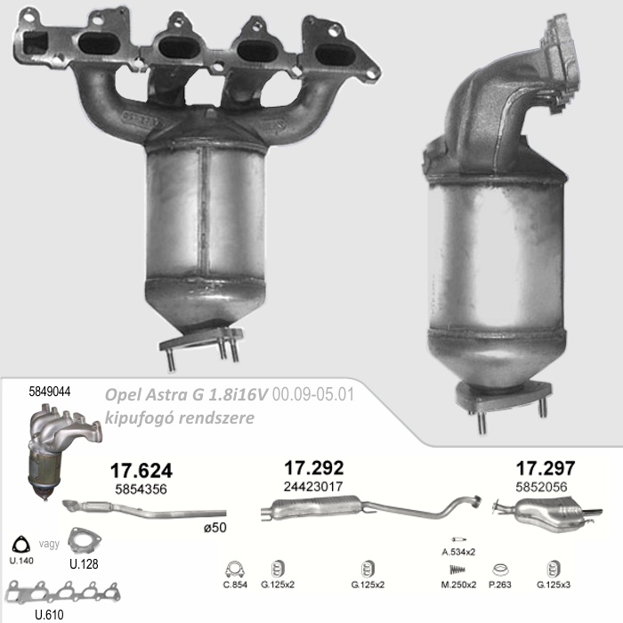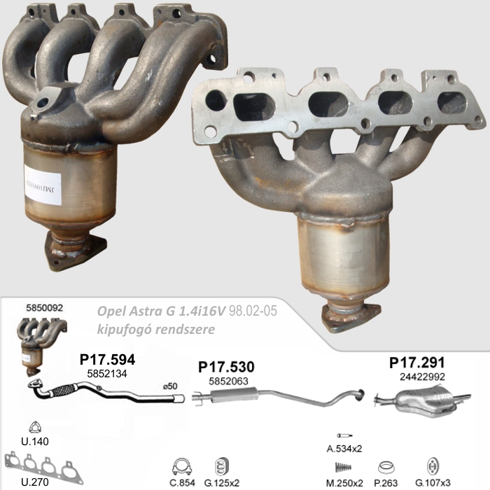 Opel Zafira A 1.6i16V (motorkódja: Z16XE) 1999.04 - 2005.06 OE referenciaszámok (nem teljes felsorolás): 13105075 / 13106575 / 13106576 / 24412000 / 3204048 / 33000001 / 55555949 / 55556534 / 55561176 / 5849007 / 5849023 / 5849042 / 5850092 / 849177 / 850092 / 850294 / 850300 / 9229756 / R1620111 / R1620138. Méretek: • Magasság: H= 271 mm. • Katalizátor tömege: 7,80 kg. | Cikkszámok: • kipufogó sortömítés: Bosal: 256-222 Autopartner: U.270 ------------------------------------- • katalizátor referenciasz./cikkszám: Ref_oe: 5850092 Ref_Bosal: 099-458 Ref_JMJ: 1091020 BM: BM91020H | | 4.e | Opel Astra G Z18XE és Z18XEL motorkódokhoz | | Leírás: Angol BM Catalysts gyártmányú E minősített katalizátor az összes szükséges tömítéssel (U.610 és U.140), valamint talpcsavarokkal szállítva. Régóta forgalmazzuk problémamentesen. Öntvénye pontos, nem vetemedett, nem ér bele az érzékelőkbe. Járműtípusok: - Opel Astra G 1.8i16V (Z18XE, Z18XEL) 2000.09 - 2005.01