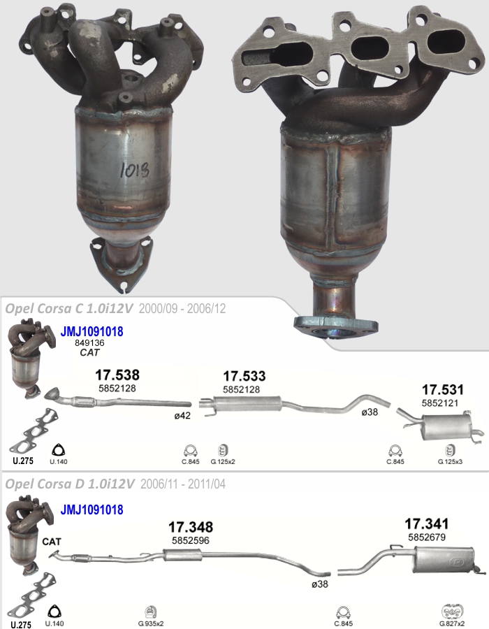 OE referenciaszámok (nem teljes felsorolás): 13106577 / 13106942 / 55555948 / 55560958 / 5849044 / 850303 / 9158633 / 9158733 / 95507207 / R1620102. Méretek: • Magasság: H= 265 mm. • Katalizátor tömege: 7,00 kg. | Cikkszámok: • kipufogó sortömítés: Bosal: 256-220 Autopartner: U.610 ------------------------------------- • katalizátor referenciasz./cikkszám: Ref_oe: 5849044 Ref_Bosal: 099-653 Ref_JMJ: 000XXX BM: BM91021H | | 4.f | Opel Corsa C,D Z10XEP motorkódhoz | | Leírás: Lengyel JMJ gyártmányú típuspecifikus katalizátor. Járműtípusok: - Opel Corsa C 1.0i 12v (Z10XE, Z10XEP) 2000/09-2006/12