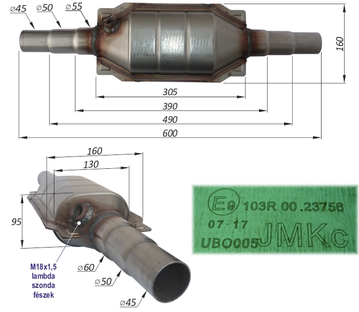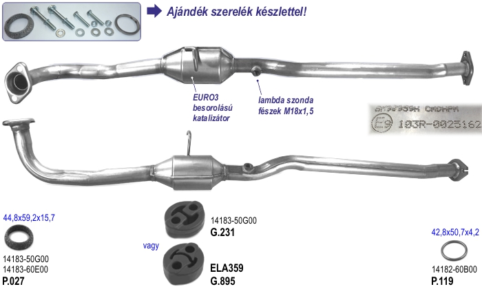 OE referenciaszámok (nem teljes felsorolás): 1411055GA1H02 / 1411055GASH02 / 1411062J00H02 / 1411062J01H02 / 1411062J02H02 / 1411062J10H02 / 1411062J12 / 1411062J12H02 / 1411063J00 / 1411063J02H02 / 1411063J12 / 1411079J00H02 / 1411079J10H02 / 14110J79J00H02 / 14110J79J10H02 Méretek: • Magasság: H= 255 mm. • Katalizátor tömege: 5,30 kg. | Cikkszámok: • kipufogó sortömítés: U.741 • katalizátor talptömítés: P.975 ------------------------------------- • katalizátor referenciasz./cikkszám: Ref_oe: 14110-62J02H2 14110-63J02H2 Ref_Bosal: 090-458 Ref_BM: BM91465H JMJ: JMJ 1091569 | | 4.d | Opel Astra G, Corsa C, Vectra B, Zafira A Z14XE és Z16XE motorokhoz | | Leírás: Angol BM Catalysts gyártmányú E minősített katalizátor az összes szükséges tömítéssel (U.270 és U.140), valamint talpcsavarokkal szállítva. Régóta forgalmazzuk problémamentesen. Öntvénye pontos, nem vetemedett, nem ér bele az érzékelőkbe. Járműtípusok: -