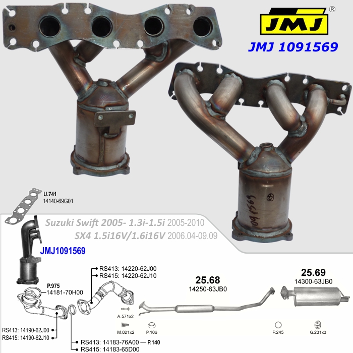 OE referenciaszámok (nem teljes felsorolás): 1411055GA1H02 / 1411055GASH02 / Méretek: • Teljes hossz L= 1243 mm. • Katalizátor tömege: 3,75 kg. | Cikkszámok: • katalizátor referenciasz./cikkszám: Ref_oe: 14190-60J00 Ref_JMJ: JMJ290959 BM: BM90959H | | 4.c | Suzuki Swift 2005-2010 1.3i16V-1.5i16V | | Leírás: Lengyel JMJ gyártmányú típuspecifikus katalizátor igen kedvező árfekvéssel a konkurens gyártmányokhoz képest. Járműtípusok: - Suzuki Swift 1.3i 1/05-