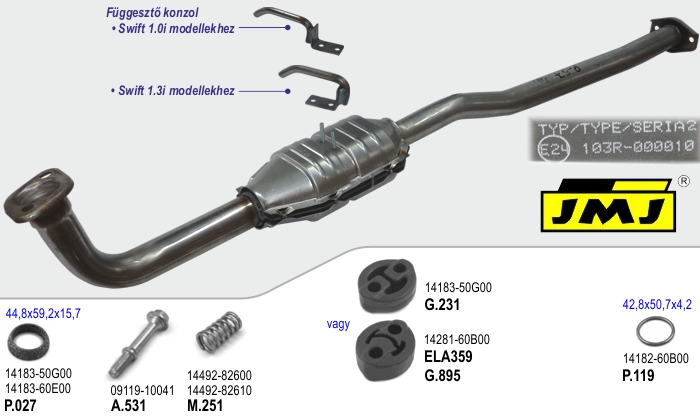 Méretek: • Teljes hossz L= 1243 mm. • Katalizátor tömege: 4,75 kg. | Cikkszám: Ref_oe: 14190-63E00 14190-66E00 14190-66E20 14190-80EB0 14190-80EC0 JMJ: P57 | | 4.b | Suzuki Swift 1.0i 2000-2005 OBD rendszerrel | | Leírás: Angol BM Catalysts gyártmányú típuspecifikus katalizátor, E minősítéssel. A két lambdaszondával és OBD rendszerrel szerelt Swift 1.0i járművek katalizátora. Amennyiben az Ön 2000 és 2005 között gyártott Swift 1.0i járművén a katalizátortest után van második -ún. monitor- lambdaszonda, úgy csak ez az EURO3-as katalizátor tudja a gyári előírások szerinti környezetvédelmi értékeket biztosítani. Járműtípusok: - Suzuki Swift 1.0i 2000-2005 OBD-vel