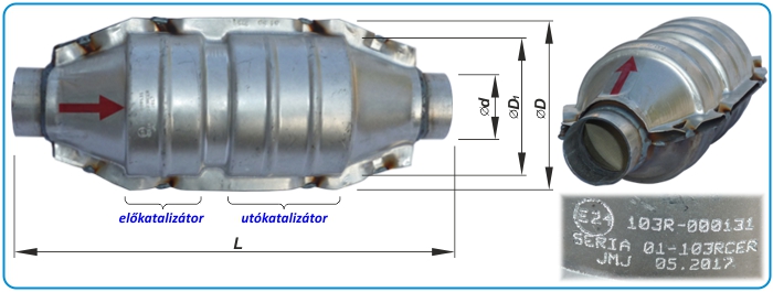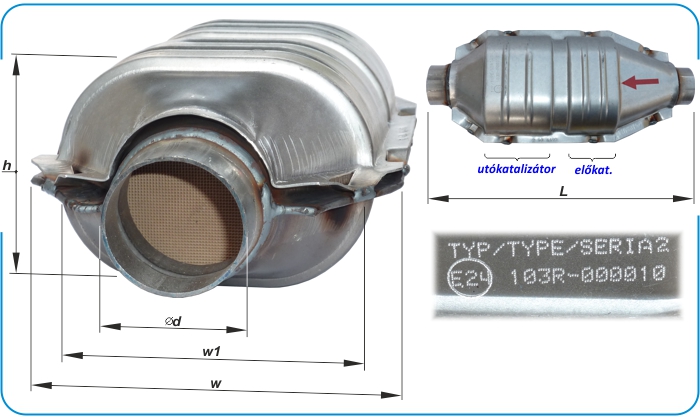 OE referenciaszámok (nem teljes felsorolás): 849415 / 13106542 / 24410080 / 24457702 / 24459702 / 3204008 / 55351943 / 55555901 / 55559169 / 5556449 / 55564499 / 5849013 / 5850108 / 5850144 / 849136 / 849167 / 849170 / 850108 Méretek: • Magasság: H= 281 mm. • Katalizátor tömege: 5,90 kg. | Cikkszámok: • kipufogó sortömítés: Bosal: 256-244 Autopartner: U.275 ------------------------------------- • katalizátor referenciasz./cikkszám: Ref_oe: 849136 Ref_Bosal: 099-460 Ref_BM: BM91018H JMJ: JMJ1091018 | | 4.g | Peugeot 206 1.1i 00-03 | Hamarosan ... | 5. Dízel univerzális katalizátorok - fém mag, 200 cpsi | | Dízel katalizátoraink NEM rendelkeznek minősítéssel, ezért közúti jármű pótalkatrészeként nem alkalmazhatóak! | Mindhárom típus 200 cpsi cellasűrűségű fém katalizátormaggal rendelkezik. A ritkább cellasűrűség miatt nehezebben dugul el a szennyeződés szempontjából intenzívebb tehelést jelentű dízel kipufogógázoktól. | Alkalmazható: 2000 cm3-ig. Teljes hossz: L=310mm Katalizátorház hossza: 250mm Teljes szélesség: W=130mm Ház szélessége: W1=105mm Ház külső Ø: D=120mm Cső külső Ø: d=55mm | Alkalmazható: 2000 cm3-ig. Teljes hossz: L=315mm Katalizátorház hossza: 270mm Teljes szélesség: W=150mm Ház szélessége: W1=130mm Ház magassága: H=105mm Cső külső Ø: d=55mm | Alkalmazható: 3000 cm3-ig. Teljes hossz: L=410mm Katalizátorház hossza: 320mm Teljes szélesség: W=175mm Ház szélessége: W1=155mm Ház magassága: H=105mm Cső külső Ø: d=60mm | | 6. Garanciakezelés katalizátoroknál | . | 6.1 | Garanciális feltételek | Garanciát vállalunk a katalizátor konverter hibátlan működésére 12 hónapra, vagy 50.000 km-ig, attól függően, hogy melyik telik le hamarabb. Az alábbi feltételek betartása kötelező: - A jármű működtetése ólommentes üzemanyaggal történik.